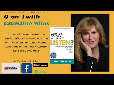 From her website: Christine Miles is a recognized expert on training individuals and organizations on how to listen in ways that transform how they lead, sell, influence, and succeed in every aspect of life. What Is It Costing You Not to Listen? covers her breakthrough system, The Listening Path,™ that equips people with the most important human skill – listening to understand.